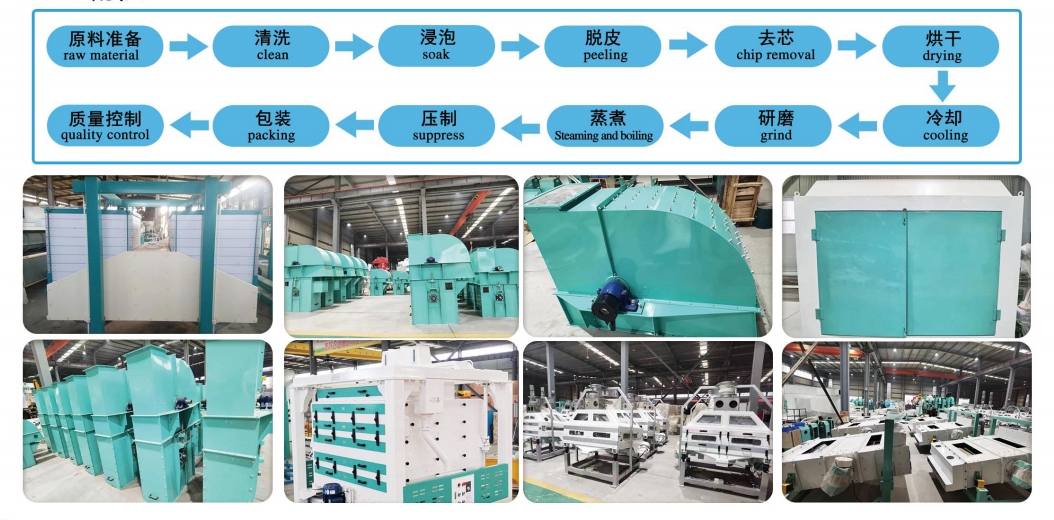 原料準備⇒清洗⇒浸泡⇒脫皮⇒去芯⇒烘干⇒冷卻⇒研磨⇒蒸煮⇒壓制⇒包裝⇒質量控制